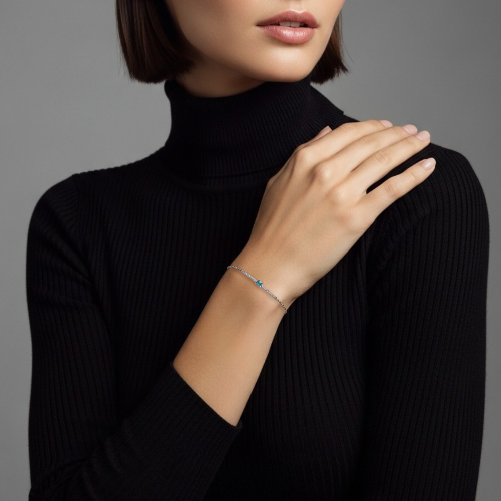 | Náramek ze 14 Kt bílého zlata s přírodním modrým diamantem doplněný o čiré diamanty. Celková délka náramku je 17 cm s očkem na zmenšení délky na 15,5 cm, řetízek typu hrášek. | |