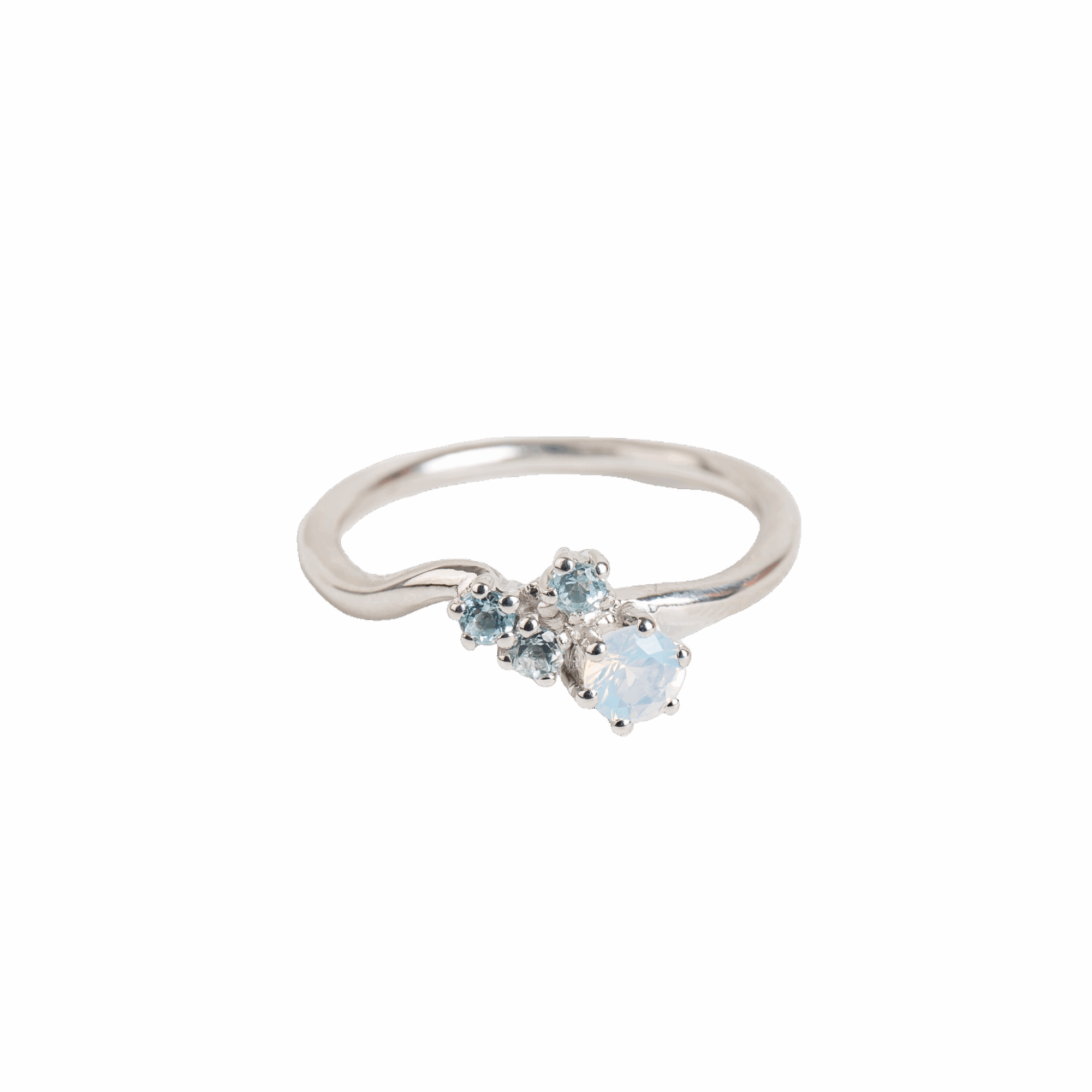 Prsten Symfonie – bílé zlato, akvamaríny, slovenský opál